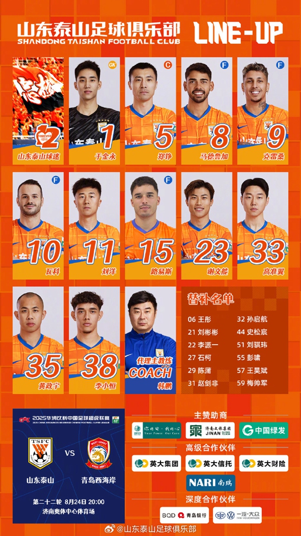 8月24日晚上8点,中国超级联赛的第22次旋转,山东·塔尚(Shandong Taishan)在家里对阵青岛西海岸的比赛,汉·彭(Han Peng)的年轻教练和肖·贾耶(Shao Jiayi)的年轻教练引起了人们的关注。在比赛的7分钟内,Kresan得分并结束了干旱。在第23分钟内,郑郑为黄色,下一个游戏将被暂停。在49分钟内,Kresan在世界上获得了任意球。在58分钟内,阿齐兹进球。在59分钟内,Waco做出了贡献,并再次扩大了分数的优势。在第78分钟,阿齐兹也得分两次。最终,泰山以3-2击败西海岸,并连续三场取得成功。 [焦点]胜利转世!泰桑队本赛季赢得了第二个三连胜,同样的对手赢得了三连胜,两连胜,两场比赛都是Yatai,Xinpeng City和West Coast,他们还完成了对三支球队的“双重杀戮”。 br揭露球的干旱!克雷恩(Kresan)完成了4个月,14轮的联赛干旱,并获得了任意球,并完成了双重打击。如今,已经打进8个进球,对手是西海岸。目标继续标记! Waco连续5次旋转并打进7球,并在这场比赛中击中了比赛。他本赛季在联盟中打进15个进球,这只是一个领先地点的法比奥(Fabio)的进球。 [Linet] Kresan和Gao Zhunyi完成了悬架,Li Yuan从受伤中恢复了。主阵容的回归使韩彭有信心连续三个成功。 Cresan目标的干旱持续了14轮。他得分的时间是第一回合对西海岸的帽子戏法。他可以打破这场比赛的干旱吗? Yu Jinyong继续担任首发守门员,而Wang Dalei由于损坏而没有进入阵容。 Zheng Zheng,Gao Zhunyi和Lopez组成了三名中后卫,而Liu Yang和Xie Wenneng充当后卫。中场球员的双重组合是玛德鲁加和黄朱尤,克雷恩回到起跑线,与vaco和li xiaoheng合作。 Li Yuanyi,Chen Pu,Shi Songchen,Peng Xiao,Wang Tong和其他人在替补席上待命,Zeka由于受伤而继续消失。由Shao Jiayi领导的西海岸目前在第10位排名第10,在最近6次扭曲中以2次胜利,3次平局和1次失利,刚刚击败了Guoan,他的病情稳定,他对撤离并不担心。但是,KO的表现很困难,在过去的8场比赛中有4次平局和4次失利。阿齐兹(Aziz),戴维森(Davidson)和里奇利(Riccielli)扮演了三名外国球员,张Xiuwei,Zhang Chengdong和Mutalifu开始了,Gao di和Xu Bin被暂停,Duan Liuyu被暂停。 [见面的条件]持续了7分钟,塔桑(Taishan)团队提前弄坏了僵局,目的得分手是克雷恩(Kresan)!郑郑从左边的十字架,明智地错过了球,而克雷恩在他身后做了一个用左脚射击,打破了进球的干旱,而陶珊队以1-0领先!在23分钟内,郑Zheng敲打了Mu Talifu,并在比赛中获得了他的第一张黄牌,因此他可以在下一个对阵Guoan的旋转中积累四个黄色。在32分钟内,Kresan将Sun Jie击倒了他坚强的身体,裁判没有犯规,Shao Jiayi不满意。在38分钟内,里塞利用倒钩将球移开,并踢了他的同事Chen Bailanggang的脸,造成了鼻桥的伤害。在42分钟内,西·温宁(Xie Wenneng)将球击中了右脚,将球击中了点球。球角非常直,守门员拯救了球。半场结束后,泰山(Tarzan)以克雷森(Kresan)的进球领导对手,对西海岸的高压力做出了反应,通常控制比赛速度。改变侧面后,陈普取代了李小龙。在49分钟内,Cresan在前场赢得了任意球,并亲自获得了点球。球飞到墙上,飞到目标。在进球的死胡同时,塔桑队以2-0领先,克雷恩两次得分!在-52分钟内,刘阳从左侧划了一个十字架,马德鲁加跳高了,前往横梁。在-58分钟内,Xu bin将球传到了顶部,郑郑未完全握住球。阿齐兹(Aziz)急忙去Yu Jinyong,首先击球。跌倒在地面后,他快速开球并得分。西海岸攻入了进球,泰山(Taishan)以2-1领先!在59分钟内,Taishan立即扩大了分数。陈普从右边划了一个十字架,西海岸的后卫朝球驶向球,并在关闭球时犯了一个错误。接球后,Wako的左脚得分,连续5次旋转。泰山(Taishan)3-1西海岸!在65分钟内,克山(Cresan)传球,刘杨(Liu Yang)从左侧划了一个十字架,中间是Maddube的标题,球由守门员抬起。在-67分钟内,Kresan用脚跟打球,Vacco让舞会飘过保护者,射击了他的右脚,并从柱子外面弹跳。塔尚的进攻就像是水,几乎再次得分。在第71分钟,戴维森(Davidson)的低射门导致Yu Jinyong移开了手,后者迅速站起来并阻止了Aziz的补充。然后,李·雅尼(Li Yuanyi)取代了Zheng Zheng。在第76分钟,Peng Xiao取代了Gao Zhunyi。在第78分钟,阿齐兹转过身,投掷了彭肖的防守,然后击落了他的右脚,球将篮球透过球门柱,然后触及了比分,泰山(Taishan)3-2西海岸!在连续替换了后背的两个起始中心之后,泰山的防守线有点混乱。在88分钟内,Liu Binbin和Wang Tong取代了Wako和Xie Wenneng。在-91分钟内,在彭肖(Peng Xiao)的带领下,球略微错过了球门。在第95分钟,彭肖在横梁上又远远射门,并保持了3-2的成绩,直到比赛结束为止。 ((海报新闻编辑Ma Hongzhen Rolling更新)
