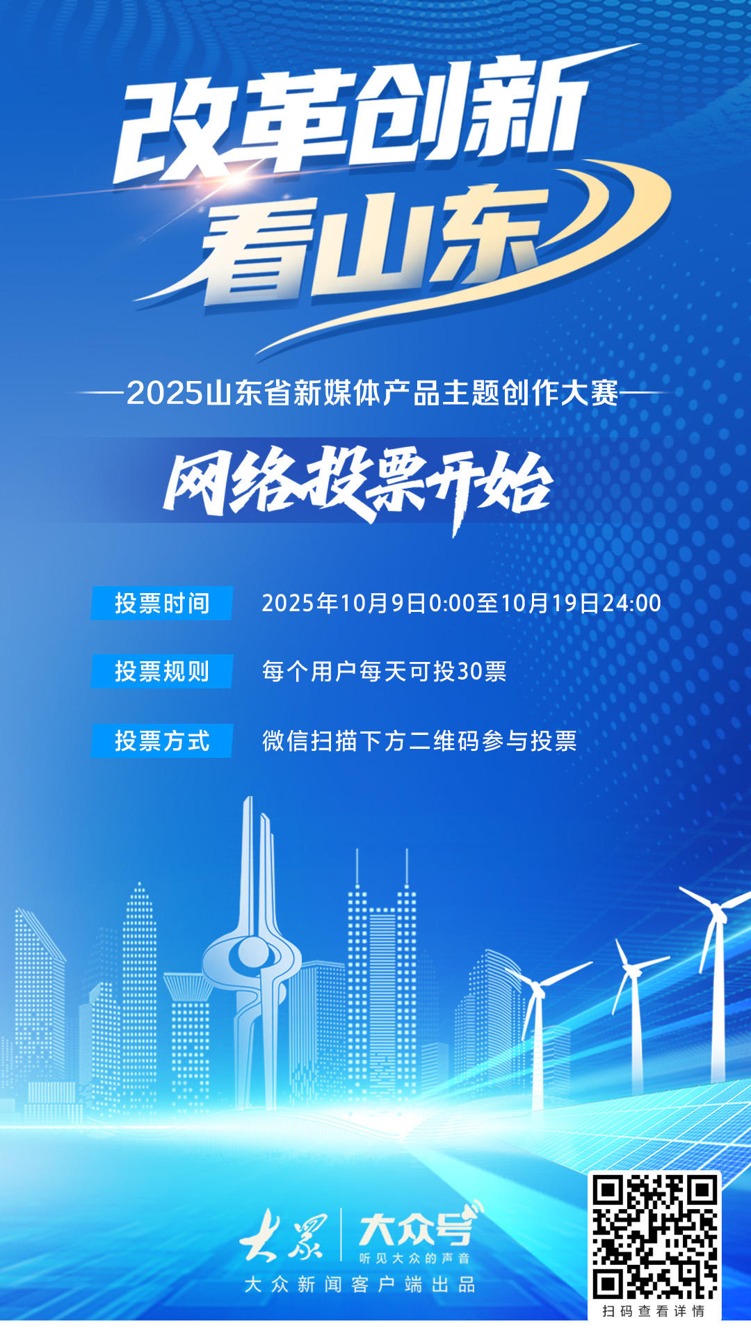 2025年是山东省全面深化改革变革的关键之年。新时代,齐鲁大地以敢为人先、脚踏实地的努力,谱写了改革变革的精彩篇章。 10月9日,由中共山东省委省机关工委、大众报业集团(大众日报)共同主办的“改革创新山东”新媒体产品创作大赛开始进入网络投票。大赛自2025年6月13日启动以来,受到了社会各界的广泛关注和热烈反响。 8月31日,共收到团体和个人创作的700余件作品,涌现出一大批展现山东改革成就的佳作。经过专家初评,最终确定87件作品入围终审。海报是哪一组你站在里面吗?哪个视频让你心潮澎湃?现在,请拿起你的手机,支持你心目中最能体现山东改革变革的作品!最终评选将结合网上喜好和专家评分,产生4枚金牌、12枚银牌、24枚铜牌以及多项效率奖。评选结果同时公布——评选后各主要平台同时公布。让我们共同见证齐鲁改革变革的视觉盛宴!投票时间:2025年10月9日0:00至2025年10月19日24:00 投票规则:每个用户每天可投30票 投票方式:我-扫描微信下方二维码参与投票(大众新闻记者 孟焕然 蔡继柴 魏一儒 策划 吴永恭)